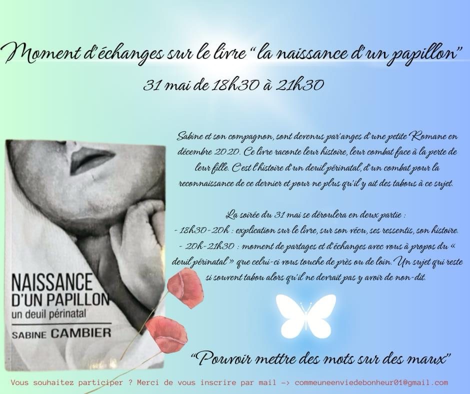 Un moment d’échanges sur le livre “La naissance d’un papillon – un deuil périnatal” est organisé par Sabine Cambier